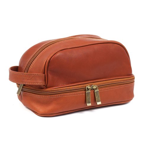 - Zipper closure around bottom of bag that opens to another compartment for additional toiletries, along with a zippered pocket